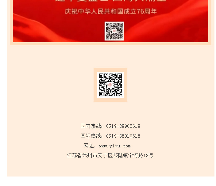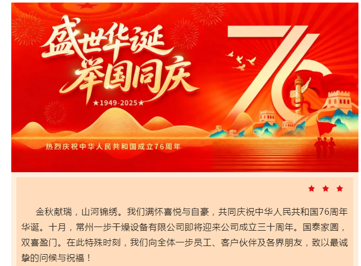 金秋献瑞,山河锦绣。我们满怀喜悦与自豪,共同庆祝中华人民共和国76周年华诞。十月,常州一步干燥设备有限公司即将迎来公司成立三十周年。国泰家圆,双喜盈门。在此特殊时刻,我们向全体一步员工、客户伙伴及各界朋友,致以最诚挚的问候与祝福!